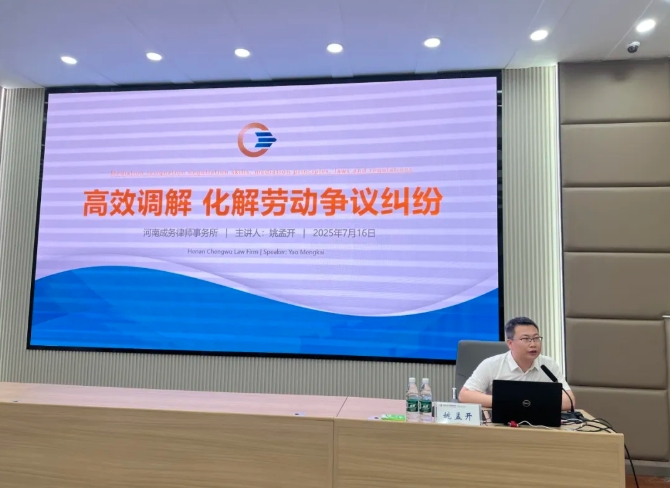 2025年7月16日上午,河南成务律师事务所高级合伙人姚孟开律师受河南大学干部培训中心邀请在河南大学培训中心进行“劳动争议调解与谈判实务”专题讲座。